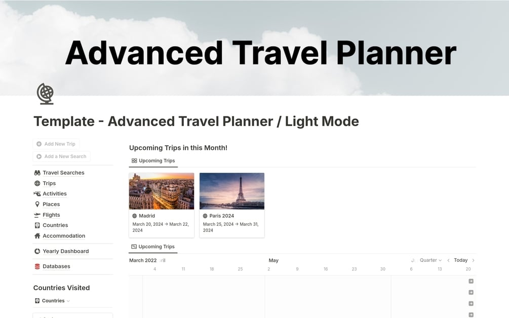The "Advanced Travel Planner" Notion Template is a testament to sophisticated travel planning, catering to both aesthetic preferences with its support for Light and Dark Modes. This adaptability ensures a personalized user experience, reflecting the diverse needs and visual comforts of the modern traveler. Embrace the future of travel planning with the Advanced Travel Planner, where functionality, elegance, and memories converge.
