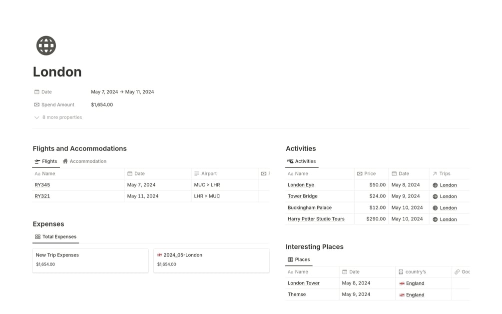 The Expense Management Database is an automated system designed for the meticulous organization and tracking of travel-related expenditures. This feature supports comprehensive budget management by categorizing costs associated with various aspects of the trip, including but not limited to, activities, flights, and accommodations. Its intuitive design and easy navigation enhance budget oversight, enabling travelers to maintain financial discipline while focusing on the joy of their journey.
